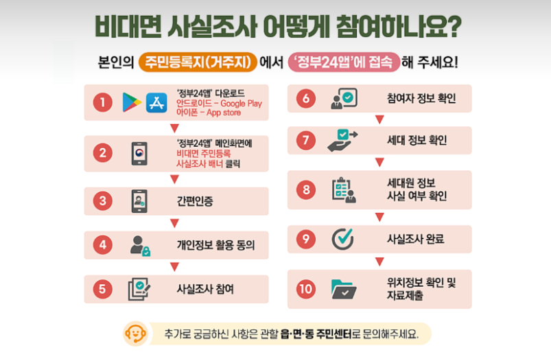 '주민등록 사실조사'란 신고한 곳과 실제 주민등록지가 일치하는지 확인하는 절차입니다. 주민등록 사실조사를 통하여 최신성을 유지하기 위해 정기적으로 시행하고 있습니다. 전국민을 대상으로 2024년 7월 22일부터 11월 18일까지 실시하며, 비대면 및 방문조사로 이루어진다고 합니다. 비대면은 정부24 어플을 이용하며 7월 22일부터 8월 26까지, 방문은 미참여자 및 중점조사 대상으로 8월 27일부터 1월 15일까지입니다.